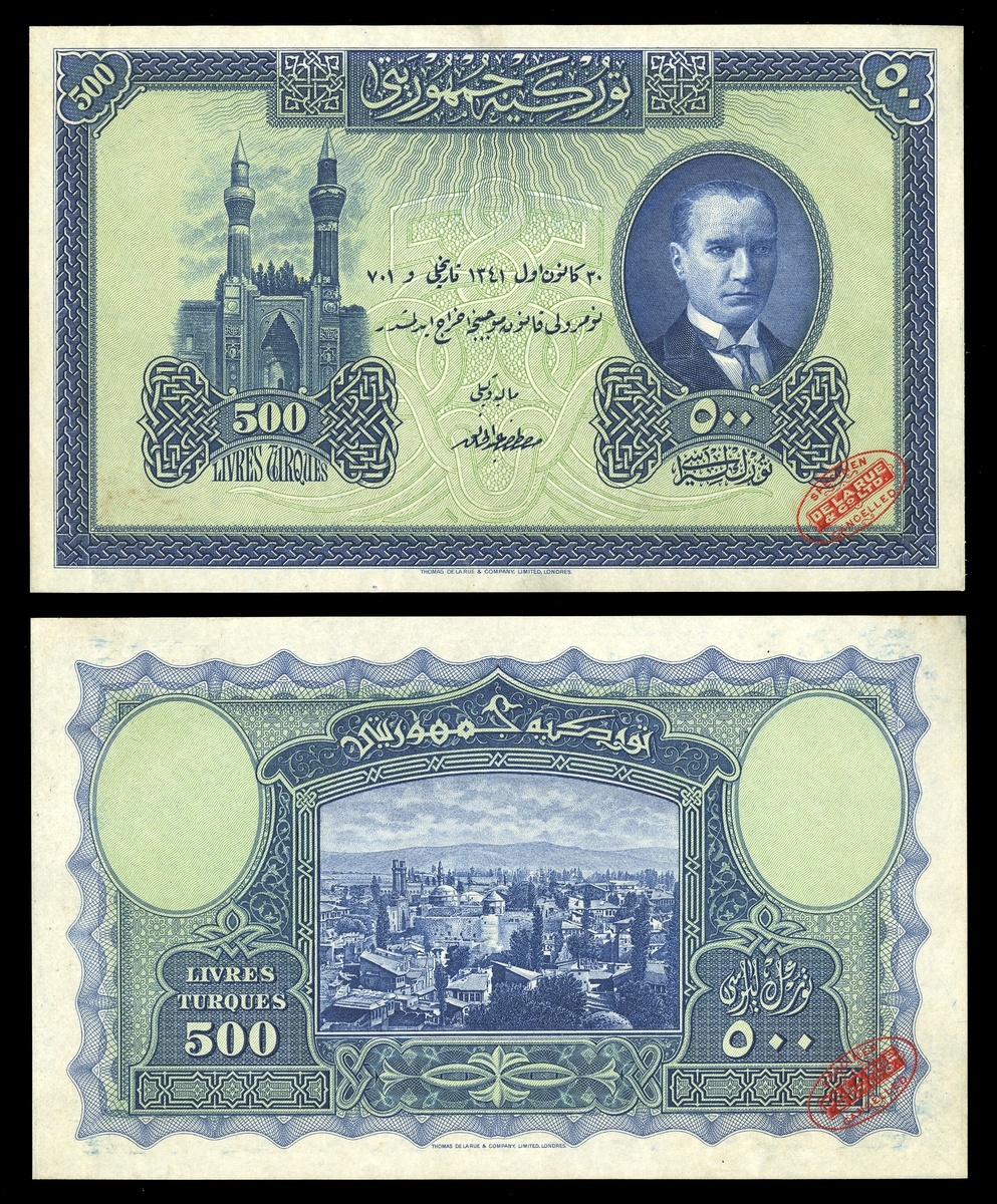Turkey. Republic. Ministry of Finance State Notes. 500 Livres Law of AH 1341 (1926). P-124ctp. Color Trial Front and Back Proofs. Blue and yellow-green. Gök Medrese in Amasya at left, Kemal Ataturk at right; Sivas townview on back. Red oval DLR stamp bottom right. Very light trace of mounting on blank side of front. Uncirculated
