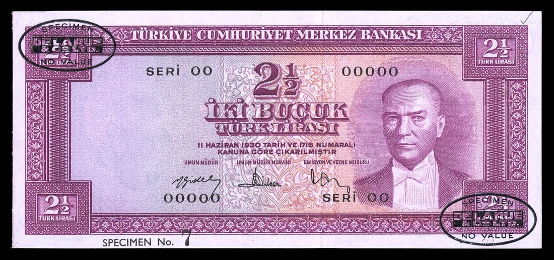 Turkey. Republic. Türkiye Cümhuriyet Merkez Bankasi. 2 ½ Lira. Law of 1930 (1957 issue). P-152s. Specimen. No. 00 00000-7. Signed Mustafa Nail Gidel, Fikri Diker, Ekrem Sungar. Lilac on multicolor. Kemal Atatürk at right wearing bowtie; Bank headquarters on reddish back. Black oval DLR stamps top left bottom right. Tiny annotation top right. Slight trace of mounting back edge, Uncirculated.