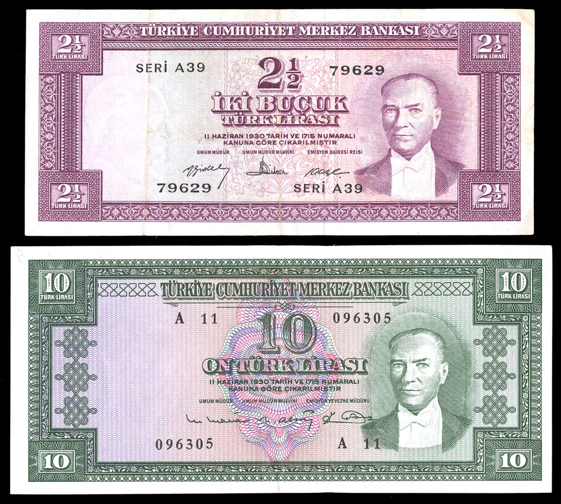 Turkey. Republic. Türkiye Cümhuriyet Merkez Bankasi. Law of 1930, Fifth issue (1952-1960) octet: 2 ½ Lira (2). P-153. F+ and VF, 5 Lira P-154. VF, moderate fold stain on back; 10 Lira. P-157 (2). Fine, and About VF with small edge tear; P-158. F-VF; and P-161. EF. Kemal Atatürk wearing bowtie at right. [8]