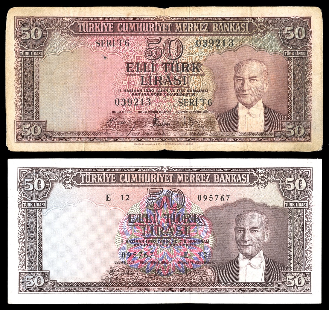 Turkey. Republic. Türkiye Cümhuriyet Merkez Bankasi. Law of 1930 (1951-1960 issues). Variety quintet of 50 Lira. P-162-166. Kemal Atatürk at right wearing bowtie; Victory Statue at Ulus Square on Brown, Orange, Red, Green, Brown back. Fine, graffiti number on back; VG, Fine, Fine with pinhole, and Choice VF. [5]