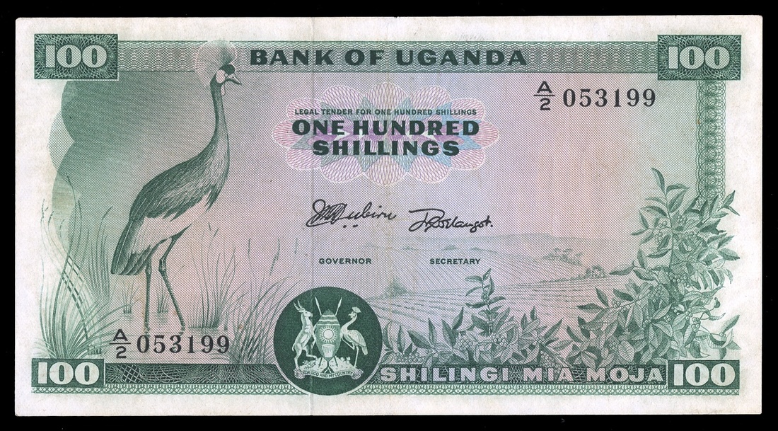 Uganda. Bank of Uganda. 100 Shillings. ND (1966). P-4a. Green on multicolor. Without "FOR BANK OF UGANDA" below value at center. Crowned crane at left. EF.