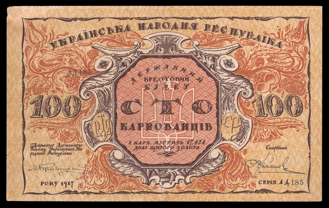 Ukraine. Autonomous Republic. Central Rada. 100 Karbovantsiv. 1917. P-1b. Brown, orange and yellow. Inscription in Polish, Russian and Yiddish on black, green and pink back. Corner edge bump, top left, EF.