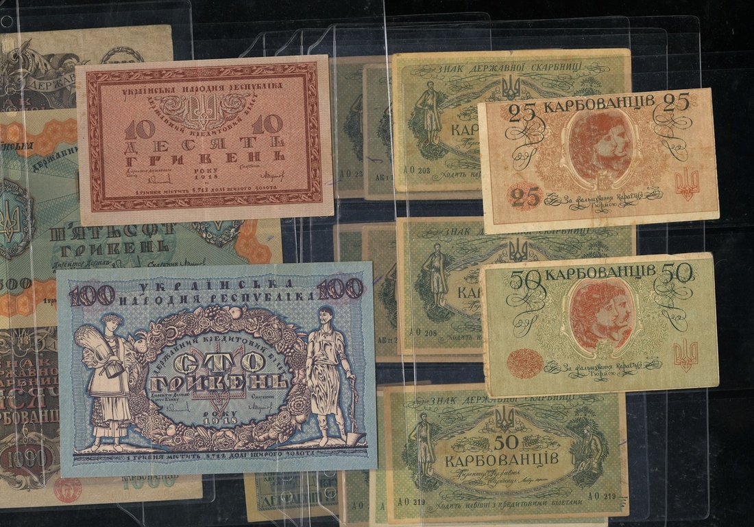 Ukraine. Autonomous Republic. 1918 Issues: State Treasury Notes - 25 and 50 (10) Karbovantsiv. P-3, 4b. The first Fine, the others VG-VF; 1000 Karbovantsiv. P-35 (2). VF-F and AU ; Postage Stamp Currency. 10, 20, 30 (both colors), 40 and 50 Shahiv. P-7, 8, 9 a, b; 10a, 11a. VF-Unc.; and State Credit Notes. 2, 10, 100 and 500 Hryven. P-20a, 21a, 22a, 23. VF, EF, VF and Unc. [23]