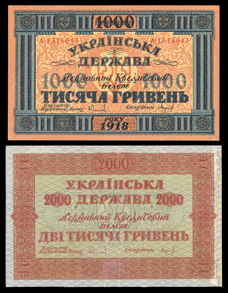 Ukraine. Autonomous Republic. State Credit Notes. 1000 and 2,000 Hryven. 1918. P-24, 25. Blue on orange and yellow; Red on green-blue. The former with small number inked bottom corner, the latter small repair on corner. EF-AU, good snap. [2]