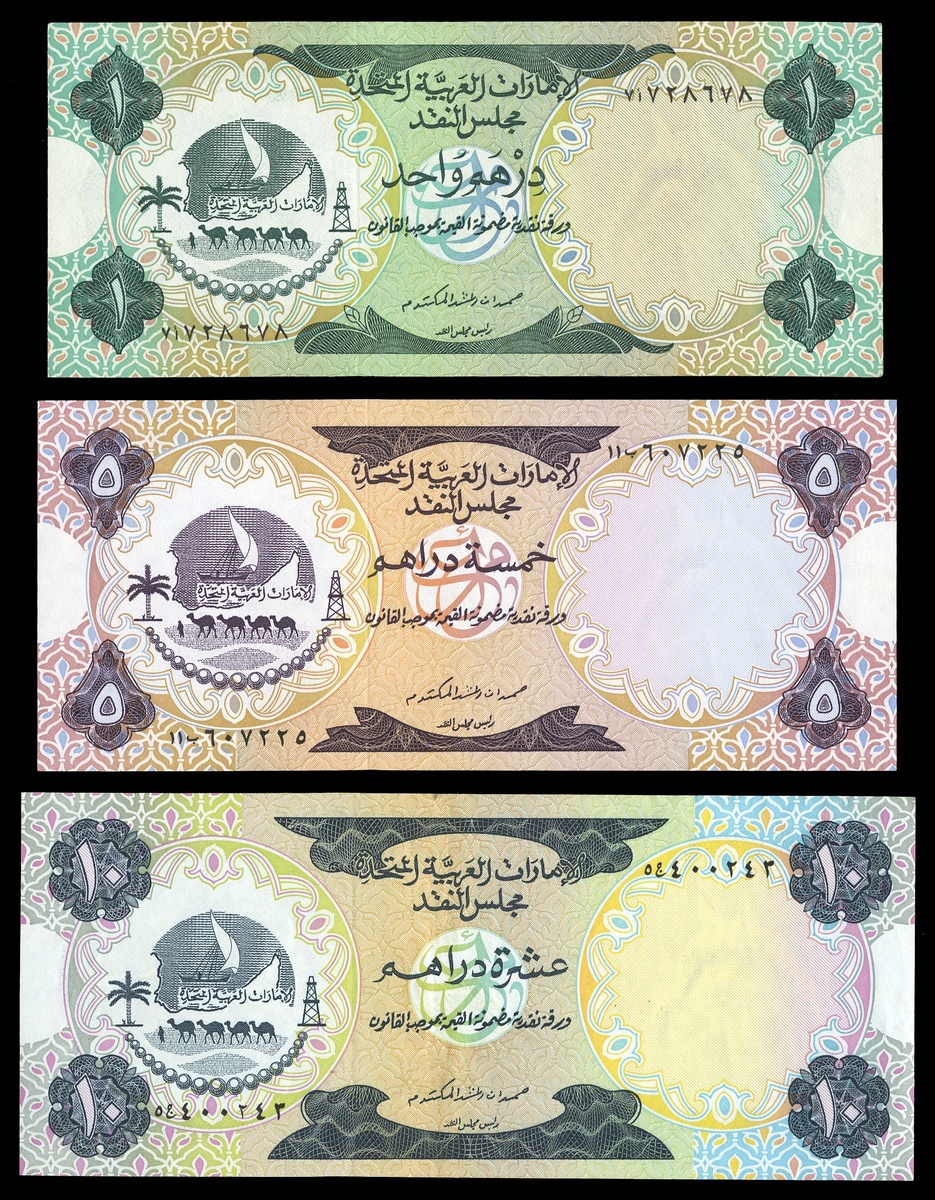 United Arab Emirates. Currency Board. ND (1973). Trio. 1, 5, 10 Dirhams. P-1-3a. Green; Purple; Gray-blue on multicolor. At left: Caravan between palm and oil derrick, dhow in background, string of pearls; Police HQ and clock tower in Sharjah. Bithna Fort in Fujairah. Aerial view of Umm al-Qaiwain. The first two Uncirculated, the latter EF. [3]