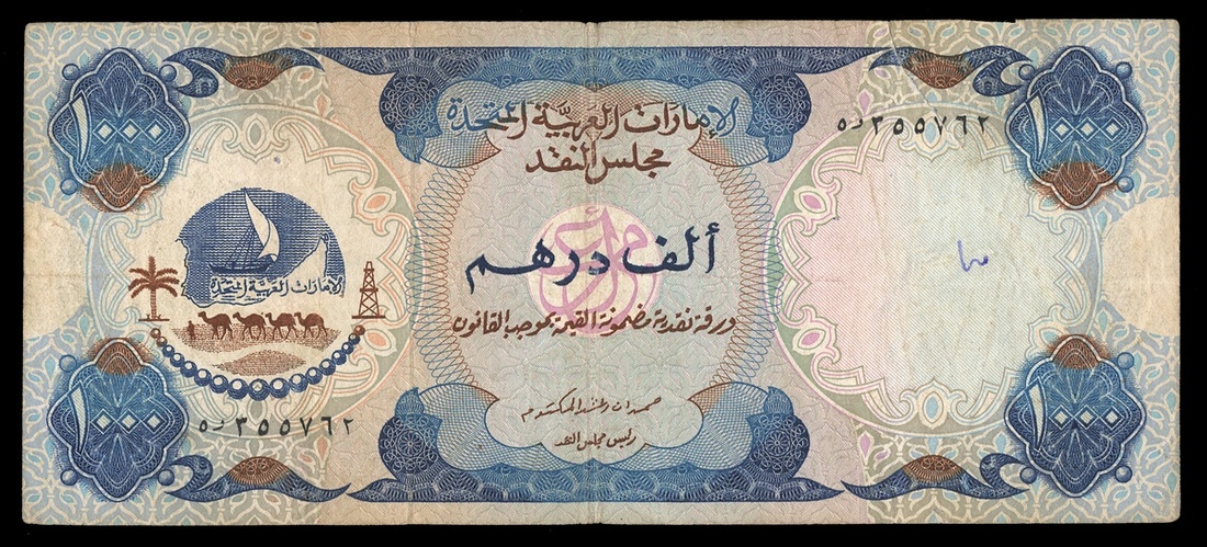 United Arab Emirates. Currency Board. 1000 Dirhams. ND (1976). P-6a. Blue on multicolor. Dhow, camel caravan, palm, and derrick at left; Fort Jahili at al-`Ain, Fahidi Fort and minaret of the Grand Mosque in Dubai on back. Small ink graffiti front watermark area, edge nick, VF.