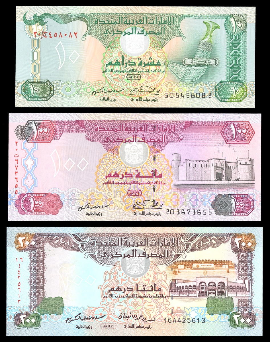 United Arab Emirates. Central Bank. 1989-1996 Issues Complete. 5 Dirhams to 200 Dirhams, all dates. P-12a to P16. Cultural and natural scenes. Crisp Uncirculated [9]