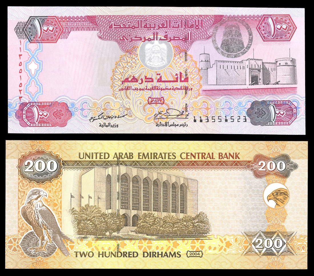 United Arab Emirates. Central Bank. 100 Dirhams. AH 1424 - 2003, AH 1427 - 2006, AH 1429 - 2008. P-30a, c. d. Red, red-violet and black on multicolor. Al-Fahidi Fort at right, silver foil stamp with tower above; Dubai Trade Tower and sparrow-hawk on back; and 200 Dirhams. AH 1425 -2004, AH 1429 -2008. Brown and black on yellow and multicolor. Sheikh Zayed Sports city and Sharia Court at right; UAE Central Bank building on back. Crisp Uncirculated. [5]
