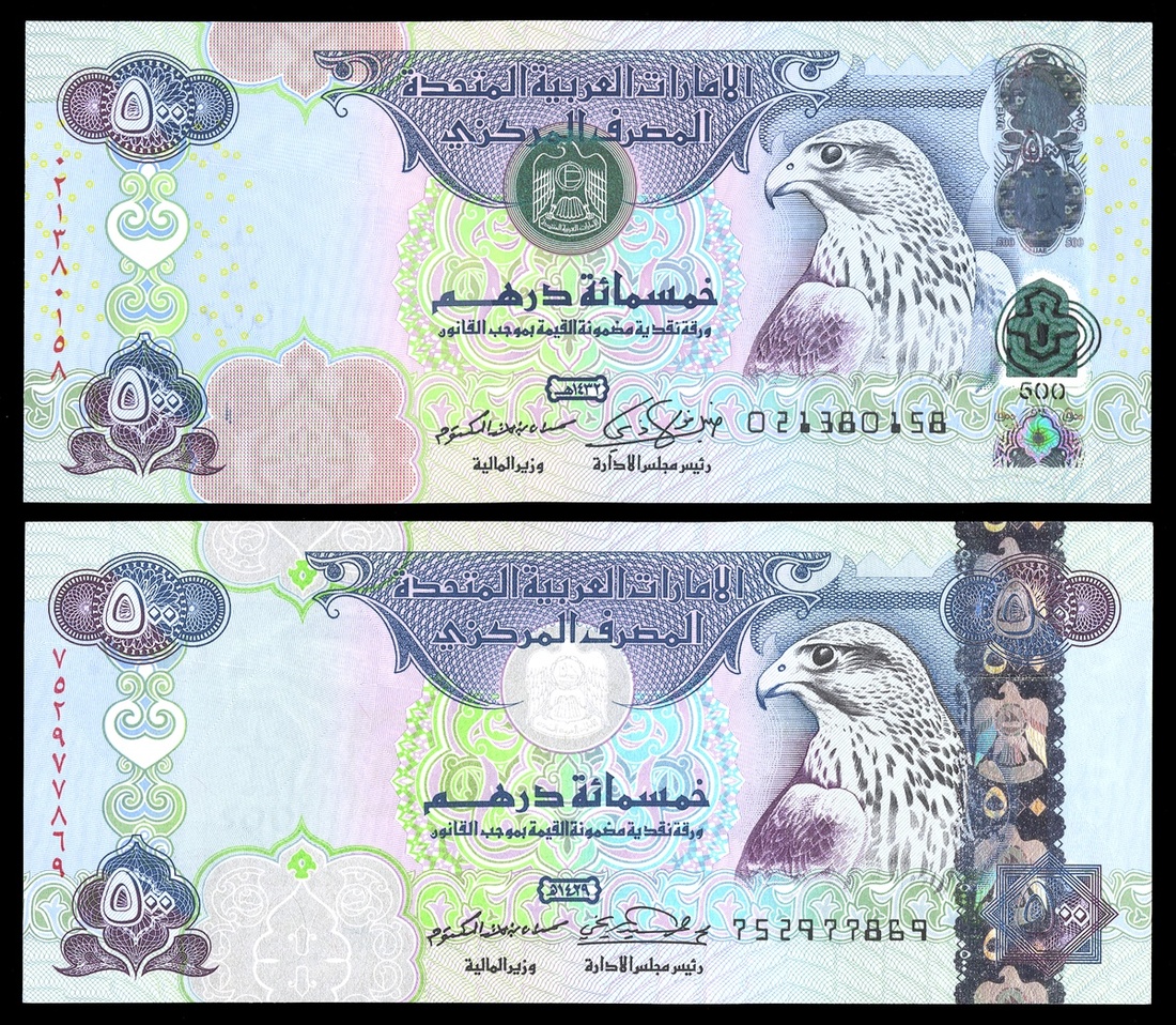 United Arab Emirates. Central Bank. Pair of 500 Dirhams. AH 1429 - 2008, AH 1432 - 2012. P-32c, d. Dark blue, black, purple and silver on multicolor. Sparrow-hawk at right; Jumeirah Mosque in Dubai on back, sparrow-hawk at left. Crisp Uncirculated. [2]