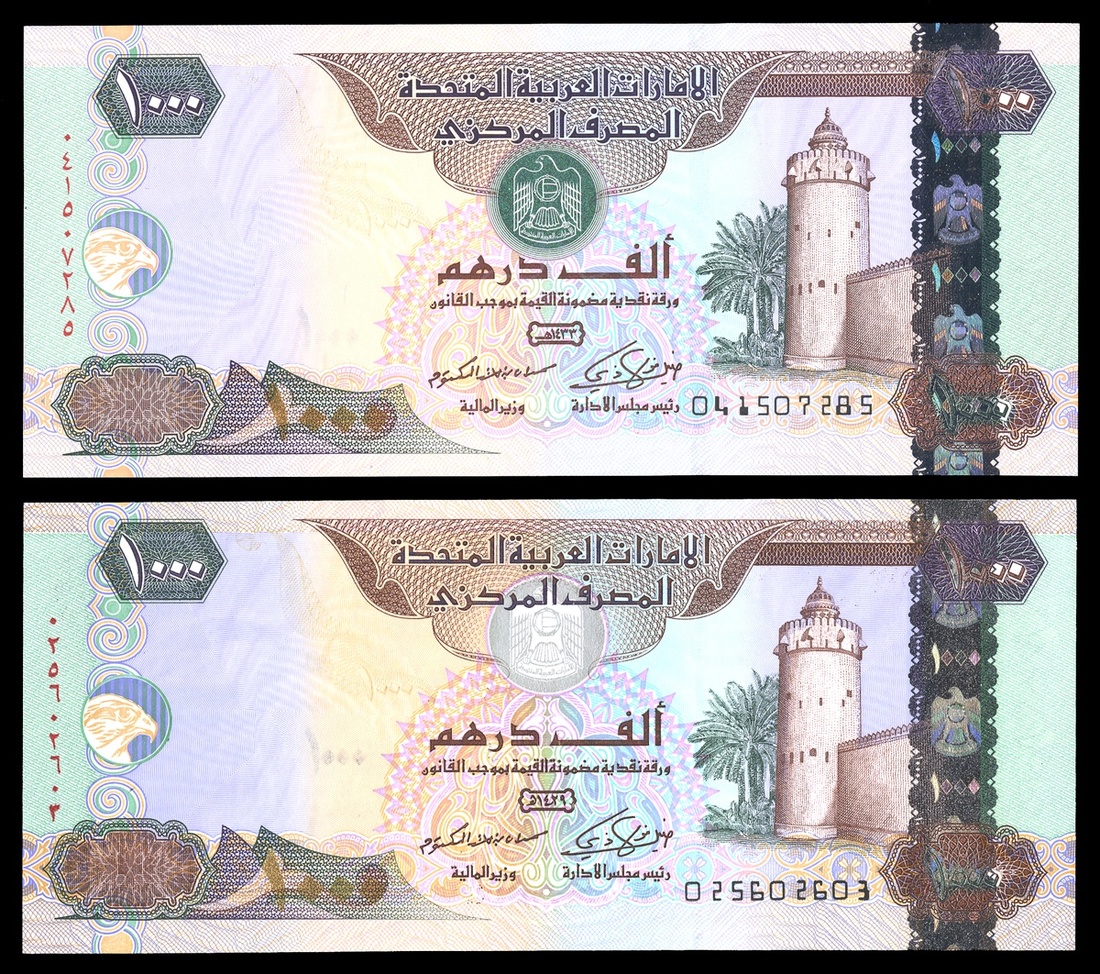 United Arab Emirates. Central Bank. Pair of 1000 Dirhams. AH 1429 - 2008, AH 1433 - 2012. P-33b, c. Brown, green and multicolor. Al-Hosn palace in Abu Dhabi at right; Abu Dhabi skyline and sparrow-hawk on back. Security foil strip. Crisp Uncirculated. [2]
