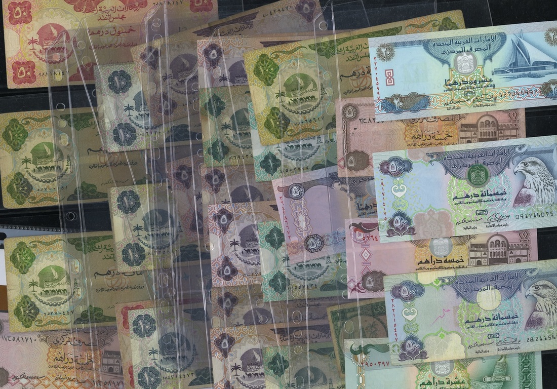 United Arab Emirates. Currency Board-Central Bank. ND (1973)-2011 issues. ND (1973) - 1 Dirham (4), 5 Dirhams (10), 10 Dirhams (6), 50 Dirhams (2), 100 Dirhams (3). P-1-5. The 50 and 100 dirhams all with graffiti and on a few others. About VF-VF+; and various Central Bank issues, 5 to 500 (2) Dirhams. One of the 500 Dirhams with graffiti. EF-Unc.; also, Qatar and Dubai. 1 Riyal. ND. P-1a. Fine-About VF. [34]