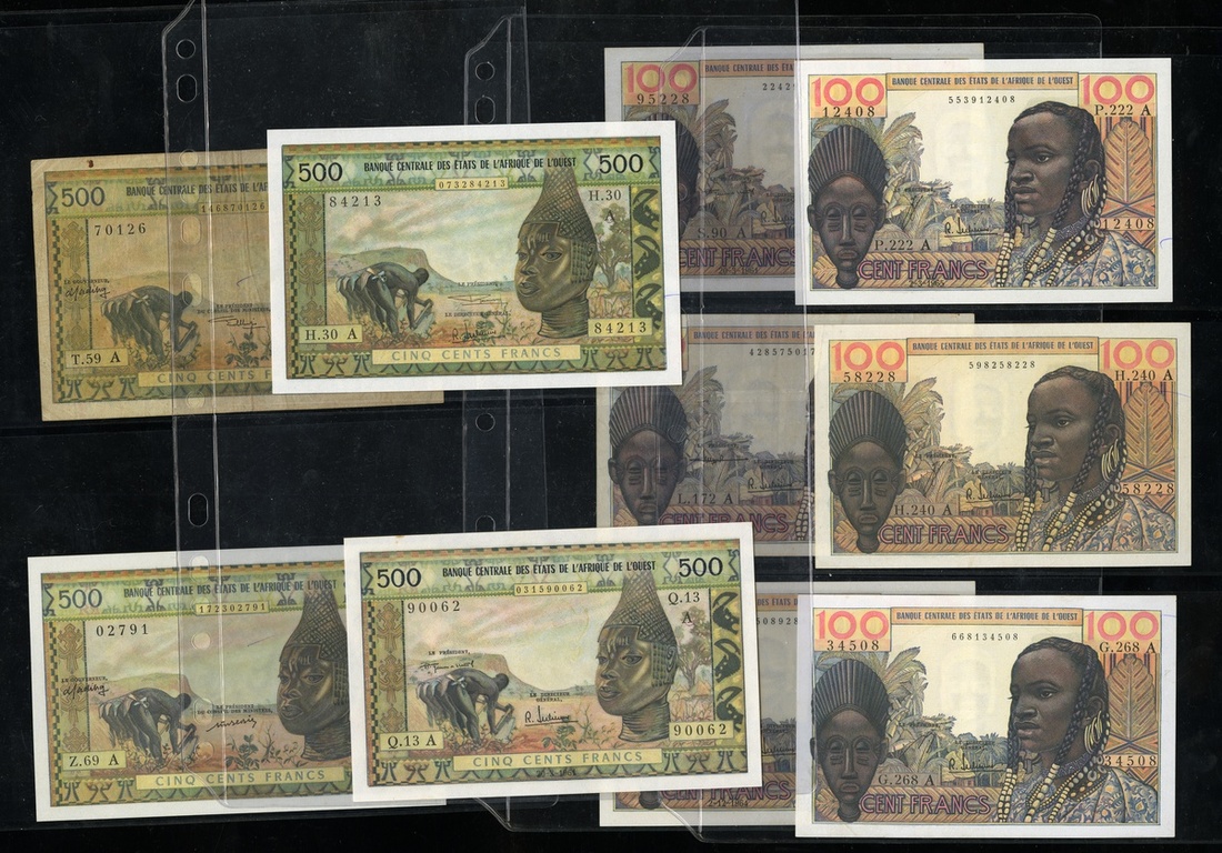 West African States. Banque Centrale des États de l'Afrique de l'Ouest. Country Code A for Ivory Coast. 100 Francs. 1961, 1964, 1965, ND. P-101Aa, b, d, e, f, g. Woman, her hair in braids, at right, mask at left; Woman with artifact on back. The second EF, the third AU, the others Uncirculated; 500 Francs. 1961, ND. P-102Ab, f, k, l. Mask at right, fieldworkers left; Woman wearing kerchief, mechanized plowing on back. Unc., EF, Fine-About VF, and Unc. [10]
