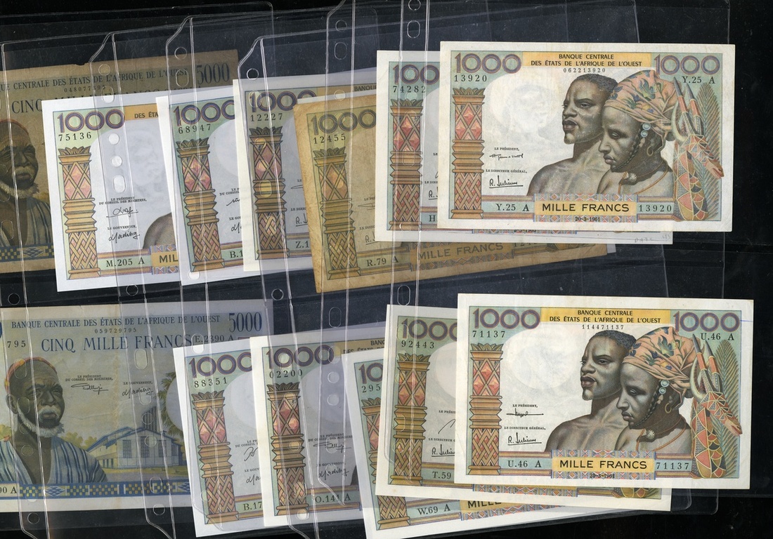 West African States. Banque Centrale des États de l'Afrique de l'Ouest. Country Code A for Ivory Coast. Complete signature set of Pick 103A 1000 Francs. 1961, 1965, ND. P-103Ab, c, d, e, f (2), h, I, j, k, l, m, n. Man and woman at center, varving at right; Bearded man, rope bridge on back. The first VF, the signature 6, Fine with staining and Unc., the last five Uncirculated, the others EF-AU, two with light penciled number in margin; also 5,000 Francs. ND. P-104Ah, i. The first VG with small hole in margin, the latter VF with small edge tear. [15]