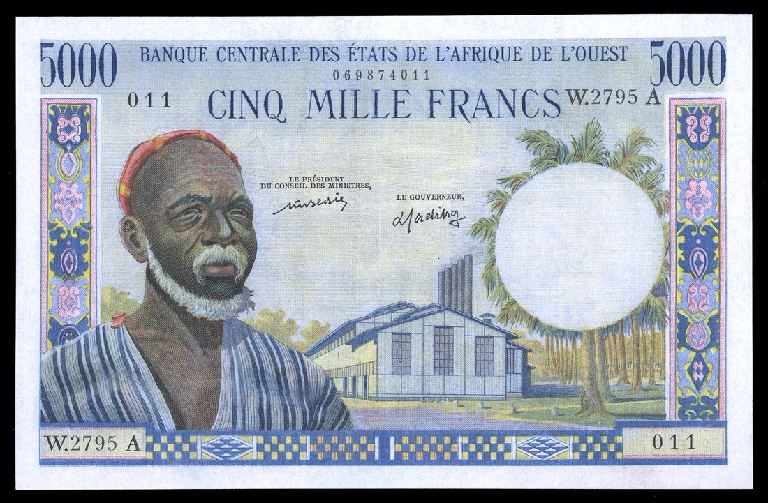 West African States. Banque Centrale des États de l'Afrique de l'Ouest. Country Code A for Ivory Coast. 5,000 Francs. ND (1977). P-104Aj. Blue, brown and multicolor. Bearded man at left, factory building at center; Woman and corn-grinding scene on back. Uncirculated.