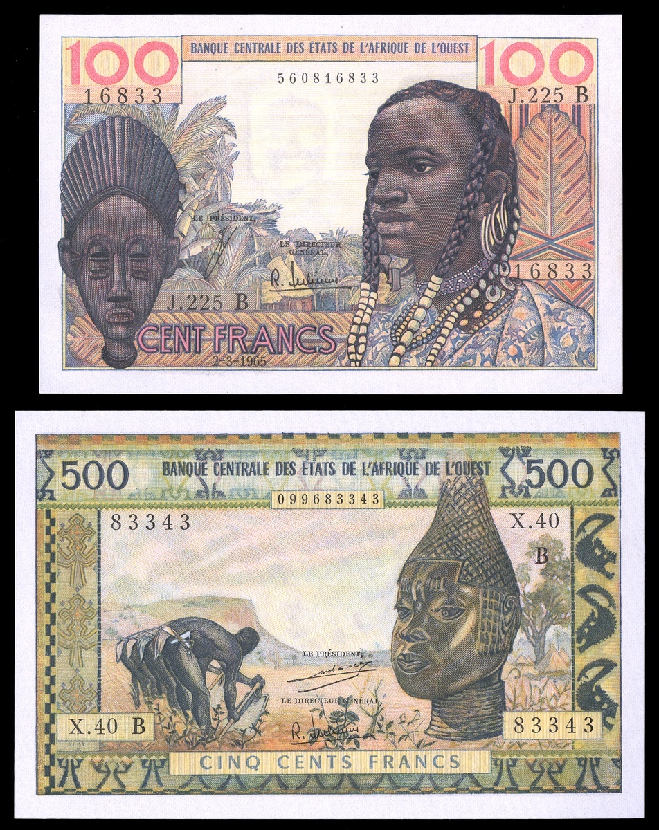 West African States. Banque Centrale des États de l'Afrique de l'Ouest. Country Code B for Benin (Dahomey). 100 Francs. 1961, 1965. Woman with braids at right, mask at left. P-201Ba, b, e. The latter AU, the others Uncirculated; 500 Francs. ND. P-202Bh j, l. Mask at right, fieldworkers left. Unc., About VF with some spotting, and AU. [6]