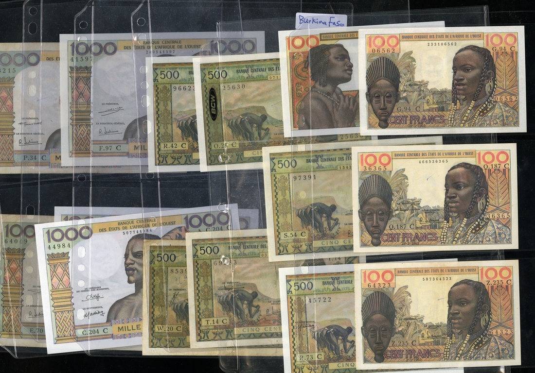 West African States. Banque Centrale des États de l'Afrique de l'Ouest. Country Code C for Burkina Faso. 100 Francs. 1961, 1965, ND. P-301Ca, b, e, f. Woman with braids at right, mark left. The third EF, the others Uncirculated; 500 Francs. 1961, 1965, ND. P-302Cc, e, g, k, l, m. Mask at right, fieldworkers. VF, Fine with graffiti, Unc., Unc., VF, Unc. with small repair at edge; 1000 Francs. 1961, ND. P-303Cb, g, i, n, o. Fine, edge tear, smudge; About VF, last three Unc., first of which tiny penciled number in margin. [15]