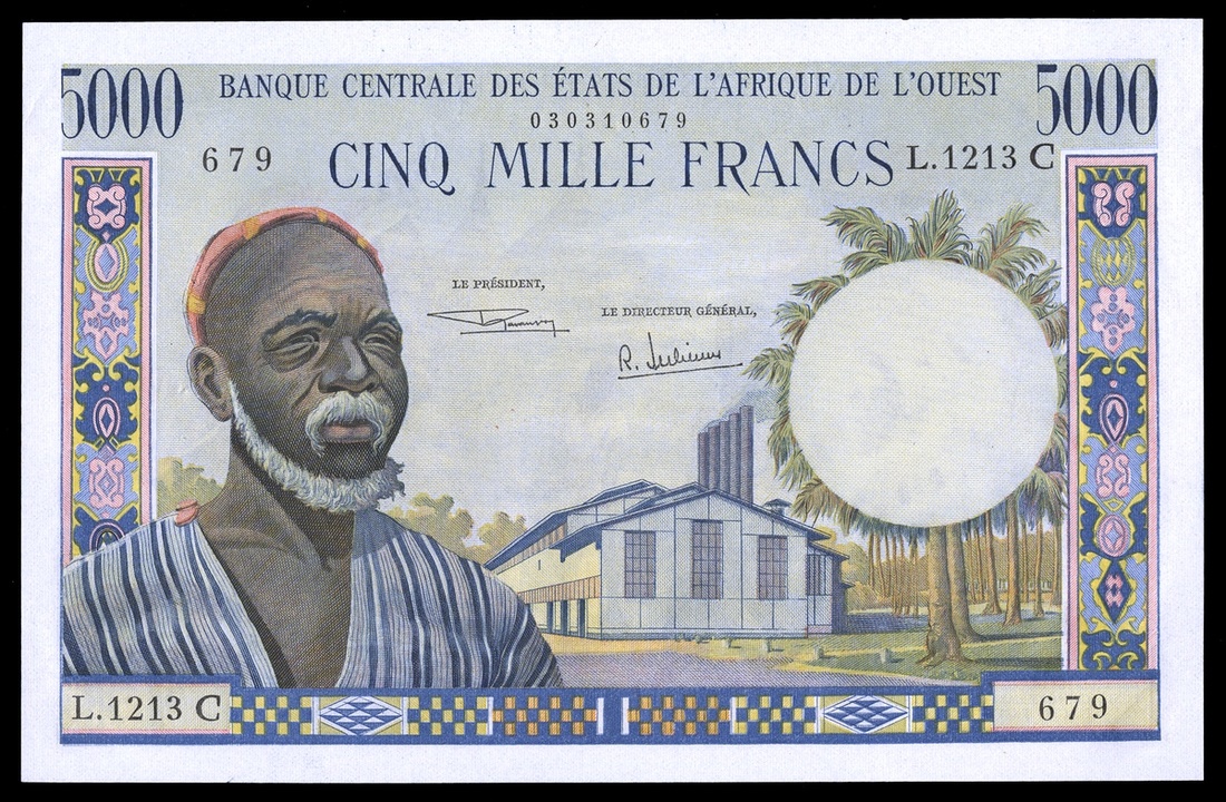 West African States. Banque Centrale des États de l'Afrique de l'Ouest. Country Code C for Burkina Faso. 5,000 Francs. ND. P-304Ch. Bearded man at left, factory building center; Woman and corn-grinding scene on back. AU.