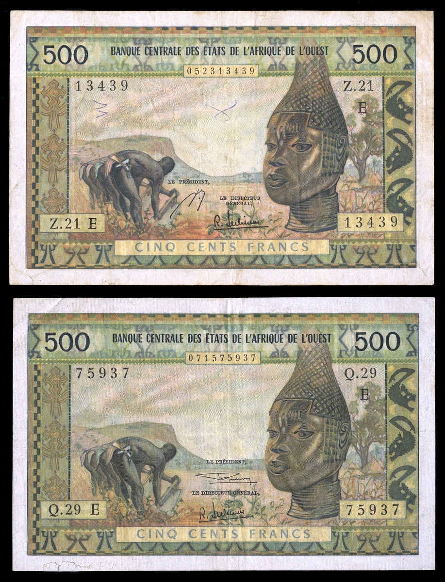 West African States. Banque Centrale des États de l'Afrique de l'Ouest. Country Code E for Mauritania. Pair of 500 Francs. ND. P-502Ef, g. Mask at right, fieldworkers; Woman at left, mechanized plowing. First small graffiti, light fold stain. VF [2]