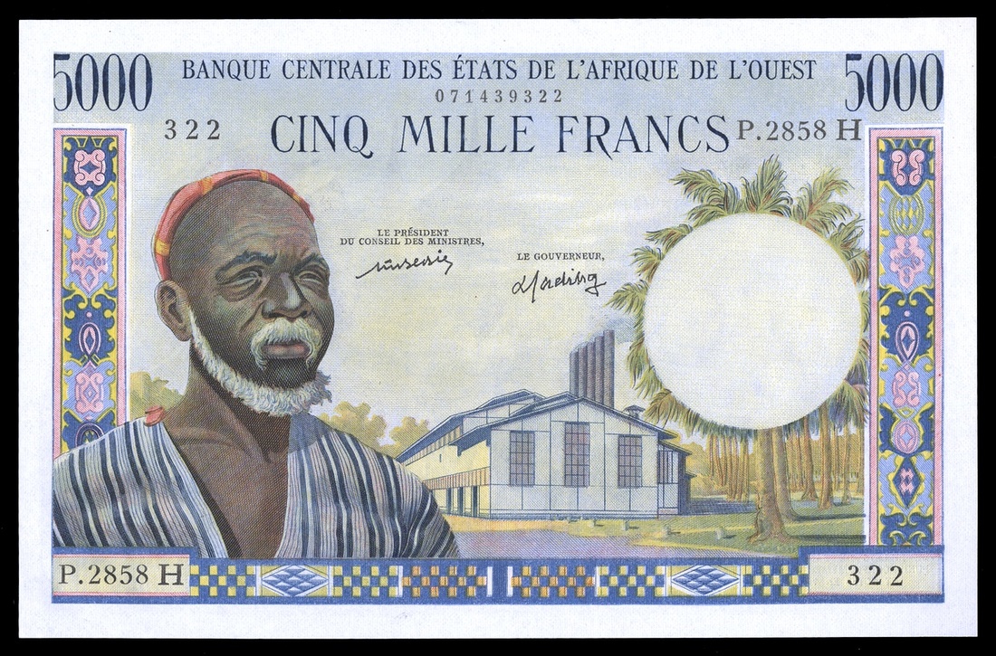 West African States. Banque Centrale des États de l'Afrique de l'Ouest. Country Code H for Niger. 5,000 Francs. ND (1977). P-604Hm. No. P.2858 H 322. Bearded man at left, factory building center; Woman and corn-grinding scene on back. Uncirculated.