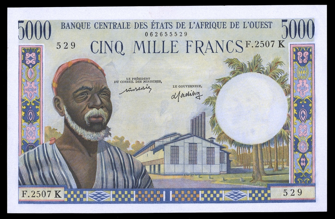 West African States. Banque Centrale des États de l'Afrique de l'Ouest. Issue for Senegal. 5000 Francs. ND (1977). P-704Km. Blue and brown and multicolor. Bearded man at left, building; Village scene with woman and corn-grinders on back. Very light teller handling. Uncirculated.