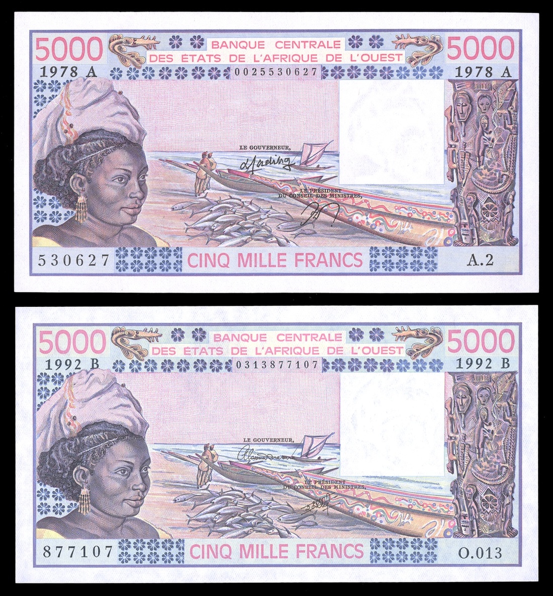 West African States. Banque Centrale des États de l'Afrique de l'Ouest. 1977-1991 issues. Variety grouping of 5,000 Francs. Various signatures and country codes. A, B (2), C (2), D, H, K (3). P-108Ab, 208Bn, o, 308Cd, n, 407Dc, 608Hh, 708Kd, f, p. Woman at left with elaborate coiffure and hair scarf, fishing boats and fish at center, carving right; Carvings, fishermen and trawlers on back. One or two with minor handling, one with tiny spot. Uncirculated. [10]