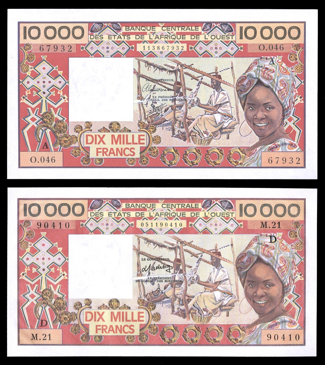 West African States. Banque Centrale des États de l'Afrique de l'Ouest. 1977-1992 issue. Variety grouping of 10,000 Francs. Various country codes and signatures: A, B (2), C (2), D, H (2), and K (2). P-109A, 209B, 309C, 408Dc, 609H, 709K. Red-brown on multicolor. Two men operating spinners at center, woman with headscarf at right; Carving, woman and textile machine on back. Generally VF-AU, one only Fine, a few better. [10]
