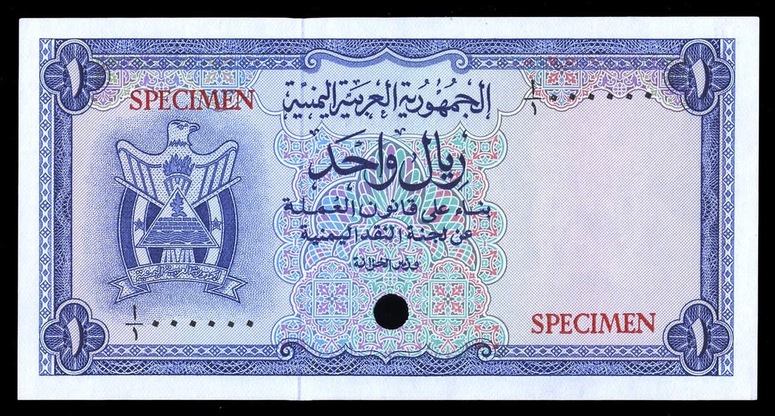 Yemen. Arab Republic. Currency Board. 1 Rial. ND (1964). P-1ct. Specimen Color Trial. No. A/1 000000-6. Blue on multicolor. Arms at left; Buildings in Sana'a on the back. Red horizontal SPECIMEN, single punch cancel. Slight handling. Uncirculated.