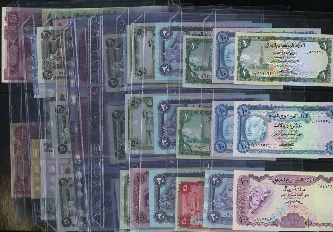 Yemen. An array of banknotes, 1973-2009. Good representation, with a majority, if not all, types, some better. EF- Uncirculated, generally the latter; also includes ND (1967) 5 and 10 Rials. EF with light stain; and South Arabian 5 Dinars, P-4a, b, Fine, staple hole, and EF. [59]