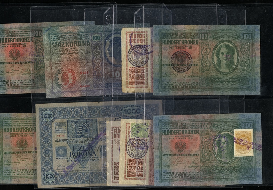Yugoslavia. Kingdom of Serbs, Croats and Slovenes. Ministry of Finance. 100 Kronen. 1919 Provisionals. First Issue. P-4. Circular black handstamp on Austrian 100 Kronen, Pick 12. Minor adhesions, VF; Second Issue. P-9B. Straight edged adhesive stamp in Slovenian Affixed to Austria Pick 12. Edge nick, About EF; also 50 Kronen. P-3, 8b. first with edge tears, latter paper tape repaired, F-VF details; and Austria 50, 100 (3) and 1000 Kronen (Pick 15, 12, 8) with uncertain Balkan handstamps. F-EF. [9]