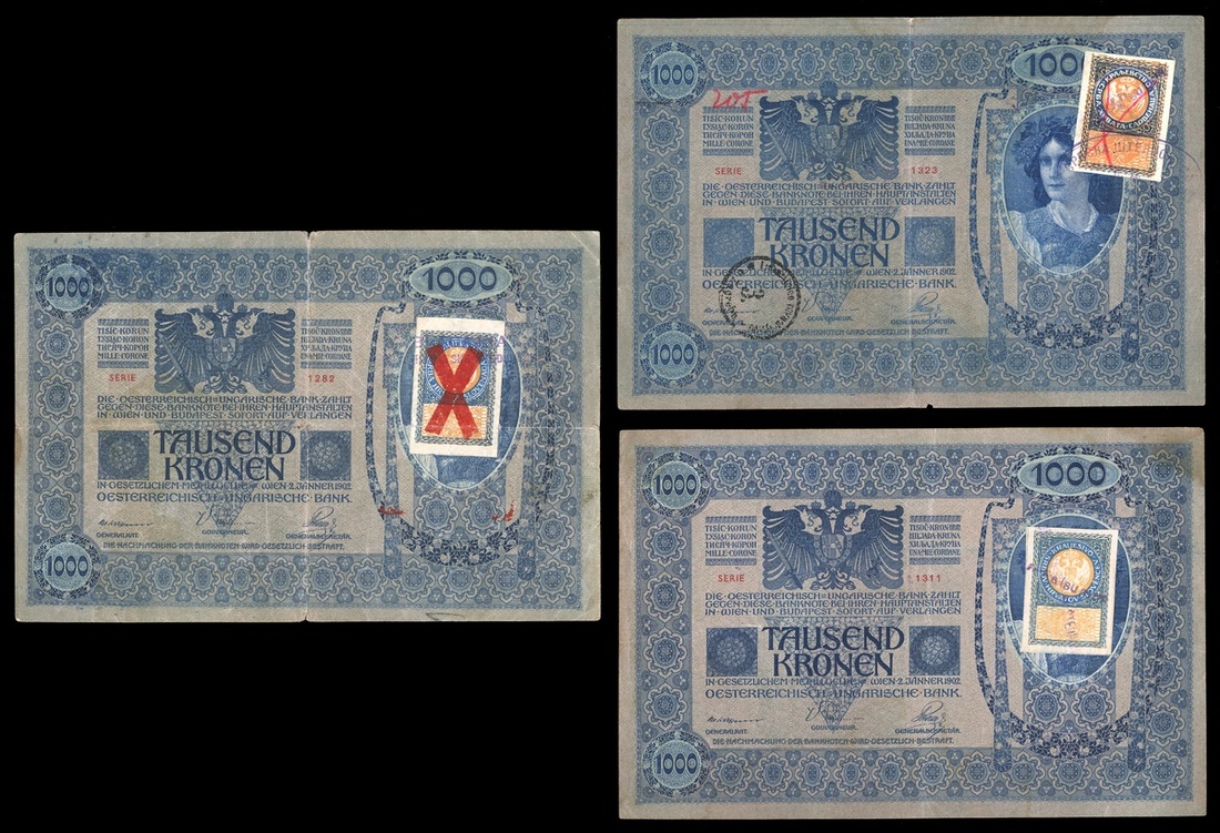 Yugoslavia. Kingdom of Serbs, Croats and Slovenes. Ministry of Finance. 1000 Kronen. 1919 Second Provisional Issues. P-10, 10A, 10B. Adhesive stamp affixed to Austria 1000 Kronen (Pick 8). Serbian -Cyrillic letters, Croatian and Slovenian. VF, EF, VF with a few small edge splits. [3]