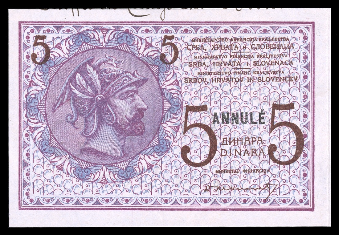 Yugoslavia. Kingdom of Serbs, Croats and Slovenes. 5 Dinara. ND (1919). P-12As. Specimen. Lilac and brown on light blue. No serial number. Helmeted man at left; Caduceus within wreath on back. Horizontal black ANNULÉ. Uncirculated.
