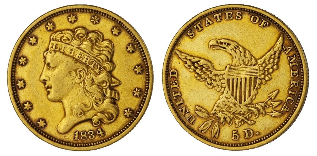 1834 Plain 4 $5 Classic Head. EF, with a few light pinscratches.