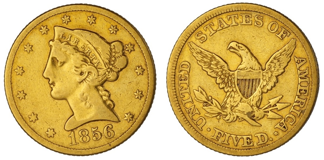 1856 $5 Liberty. F-VF.