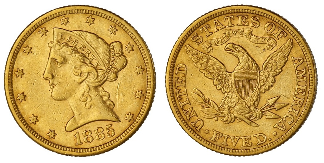 1885 $5 Liberty. EF. With a light scratch in the right obverse field.
