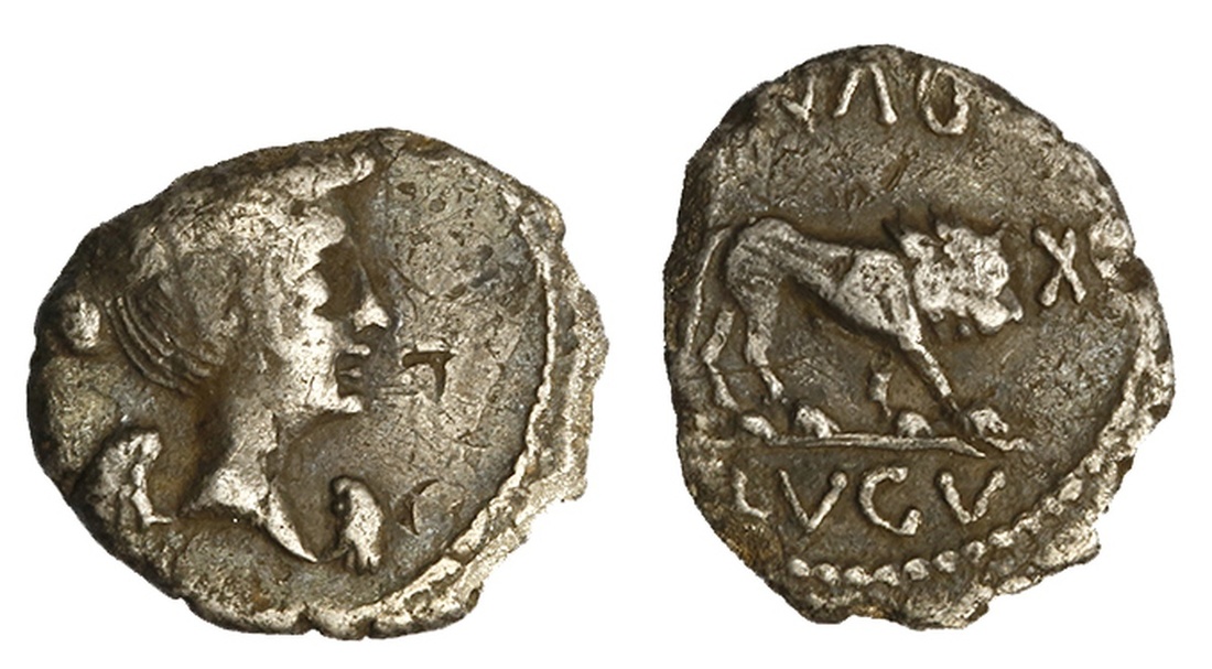 Roman Imperatorial. The Triumvirs. Fulvia, first wife of Mark Antony. AR Quinarius, 43 BC. Lugdunum. 1.47 gms. Bust of Victory right bearing the likeness of Fulvia, rev. Lion striding right between A-XL, DVNI above, LUGV in ex. Crawford 489/5, Sydenham 1160. Slight porosity. Small banker's mark. About Very Fine.
