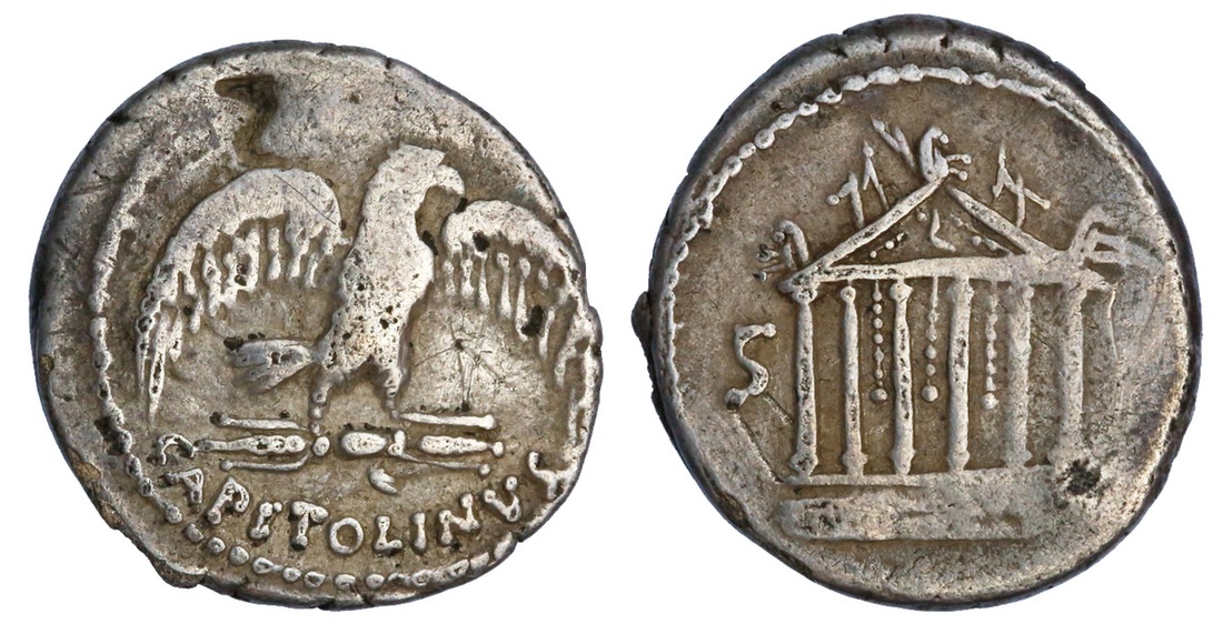 Roman Imperatorial. Moneyer issue. Petillius Capitolinus. AR Denarius, 41 BC. Rome. 3.65 gms. Eagle right, wings spread, rev. Temple of Jupiter Capitolinus. Crawford 487/2b, Sydenham 1151, Petillia 3. Test marks and banker's mark obverse field. About Very Fine.