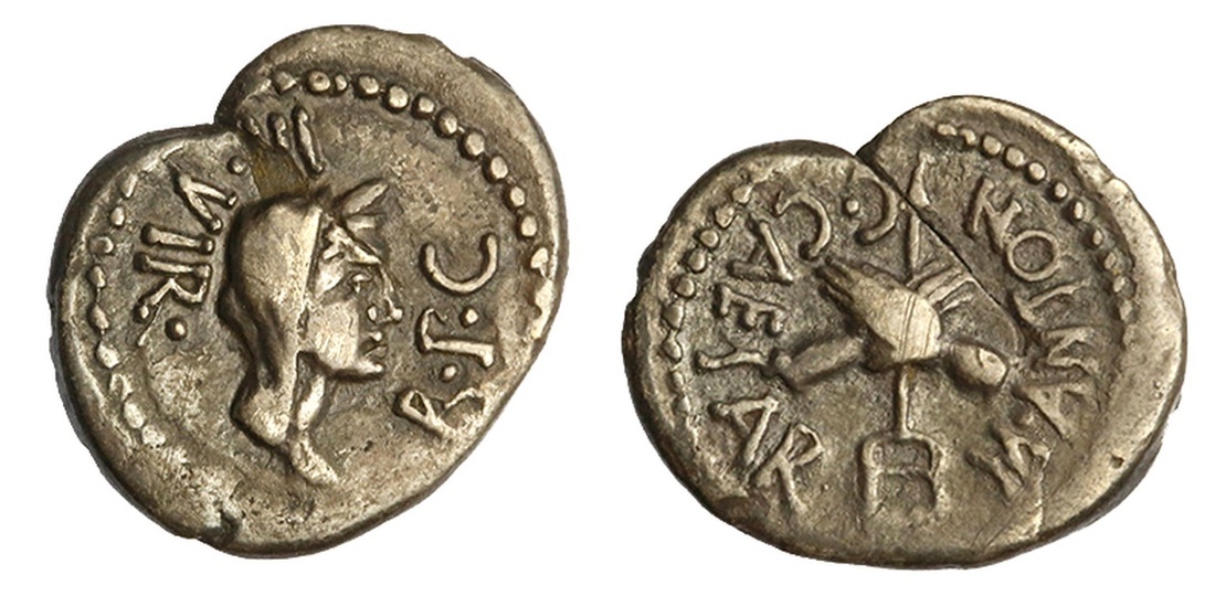 Roman Imperatorial. The Triumvirs: Octavian and Mark Antony. AR Quinarius, late 39 BC. Military mint traveling with Octavian in Gaul. 1.75 gms. R.P.C. III. VIR, veiled and diademed head of Concordia right, rev. C. CAESAR M. ANTON, clasped hands over caduceus. Crawford 529/4b, Sydenham 1195, RSC 67 (Mark Antony). Edge split. Excellent silver quality for issue. Toned. Good Very Fine.