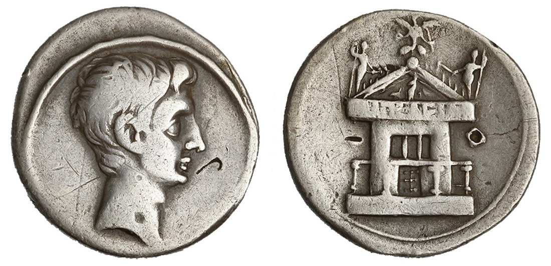 Roman Imperatorial. Octavian. AR Denarius, 30-29 BC. Italian mint (Rome?). 3.69 gms. Bare head of Octavian right, rev. The Roman Curia with tetrastyle porch, IMP CAESAR on architrave, figure seated between animals in pediment, Victory on globe at apex. RIC 266. Banker's mark and test X obverse, test marks on reverse. Fine.