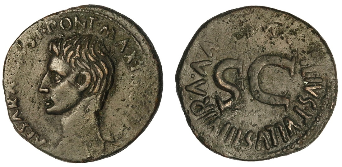 Roman Imperial. Augustus (27 BC-14 AD). AE As, struck 7 BC. 10.50 gms. M. Maecilius Tullus, moneyer. Bare head left, rev. Moneyer's legend around large SC. RIC 1436, Cohen 440. Deep olive-brown. Very Fine. Ex Tony Hardy Collection.