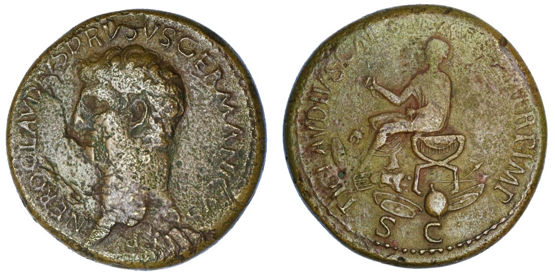 Roman Imperial. Nero Claudius Drusus (Died 9 BC). AE Sestertius, struck under Claudius, 41-42. Rome. 27.40 gms. Bare head left, rev. Claudius seated left on curule chair, holding branch, other hand on lap, weapons and armor strewn about. RIC 93. Obverse roughness. Tan-olive green. Fine.