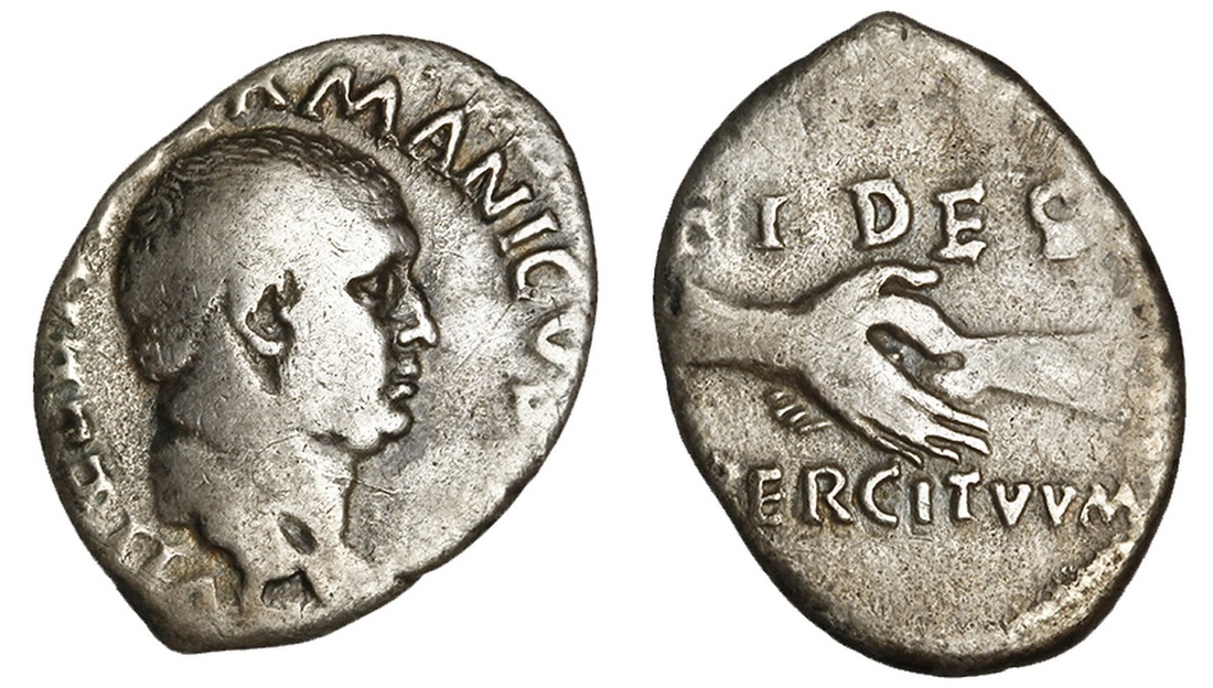 Roman Imperial. Vitellius (69). AR Denarius. 2.67 gms. Bare head right, rev. FIDES EXERCITVVM, clasped hands. RIC 67. Irregular flan. Fine.
