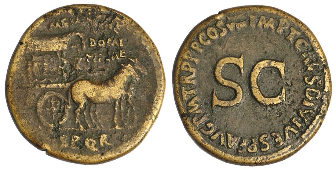 Roman Imperial. Diva Domitilla, Sr. (died before 69). AE Sestertius, struck under Titus, 80-81. 22.41 gms. Carpentum drawn by two mules right, rev. Legend around large SC. RIC 262 (Titus). Some obverse roughness. Fine.