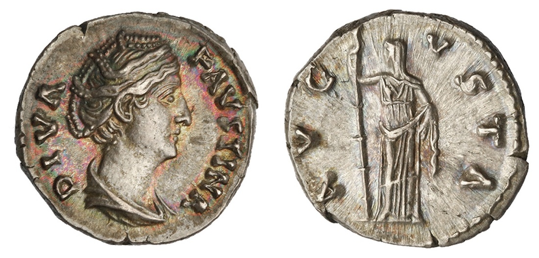 Roman Imperial. Diva Faustina, Sr. (died 141). AR Denarius. 3.55 gms. Draped bust right, rev. Ceres or Aeternitas standing l., holding torch and raising robe. RIC (Antoninus) 362. Lovely iridescent hues. Extremely Fine. Ex Stack's Auction, NY, May 24, 1989, lot 278.