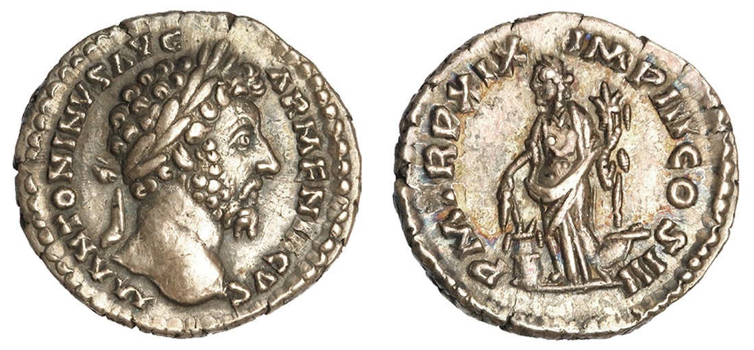 Roman Imperial. Marcus Aurelius (161-180). AR Denarius, 165. Rome. 3.42 gms. Laureate head right, rev. Annona standing left, holding grain-ears over modius and cornucopiae, prow lower right. RIC 142. Extremely Fine. Ex Bank of Canada Collection.