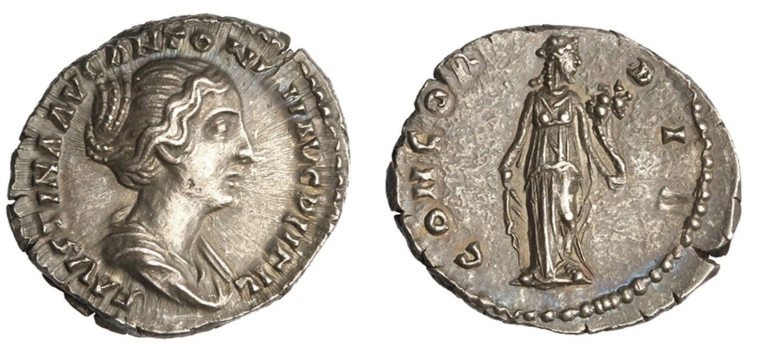 Roman Imperial. Faustina, Jr., wife of Marcus Aurelius, Augusta (147-175). AR Denarius, 149-152. 3.41 gms. Draped bust right, rev. Concordia standing, facing, head right, hiking skirt and holding cornucopiae. Long, squared chin resembling a beard. RIC 500b. Toned. Extremely Fine. Ex Stack's Auction, NY, Dec. 7, 1989, lot 3326.