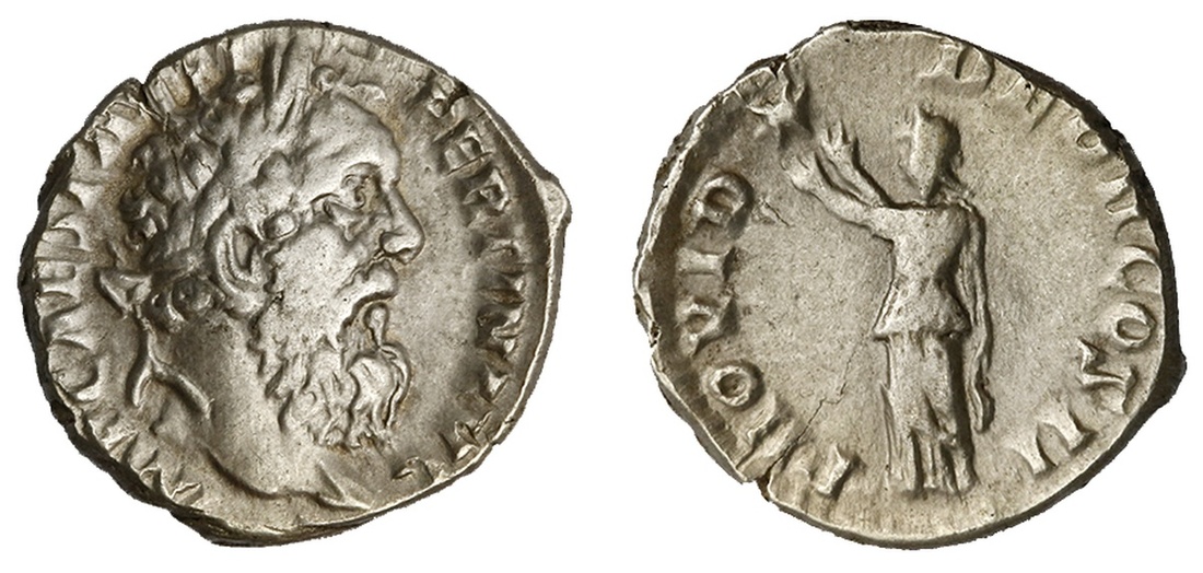 Roman Imperial. Pertinax (193). AR Denarius. 2.90 gms. Laureate head right, rev. PROVID-DEO II COS II, Providentia standing left, raising hands toward star. RIC 10a, RSC 40. Pleasing portrait. Good Very Fine.