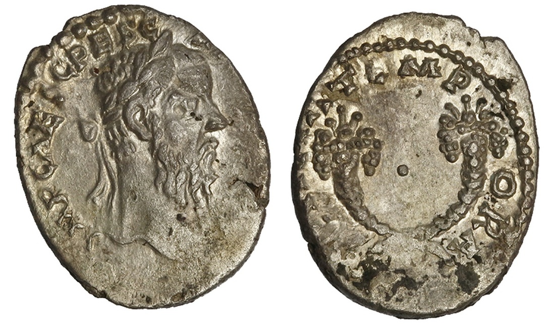 Roman Imperial. Pescennius Niger (193-194). AR Denarius. Antioch. 2.79 gms. IMP CAES C PESC-N(IGER-IVS), laureate head right, rev. (FELICITA)S TEMP-OR, Crossed cornucopiae, pellet at center. Oblong flan. Good portrait. Near Extremely Fine.