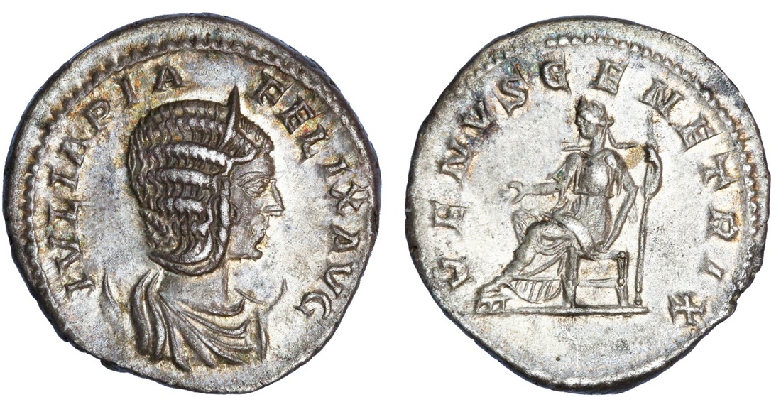 Roman Imperial. Julia Domna, Augusta (193-217). AR Antoninianus, struck under Caracalla, 215-217. Rome. 4.90 gms. Draped bust right, wearing stephane, set on crescent, rev. Venus seated left, hand outstretched, the other holding scepter. RIC 388a (Caracalla), RSC 211. Nice metal quality. Good Very Fine.