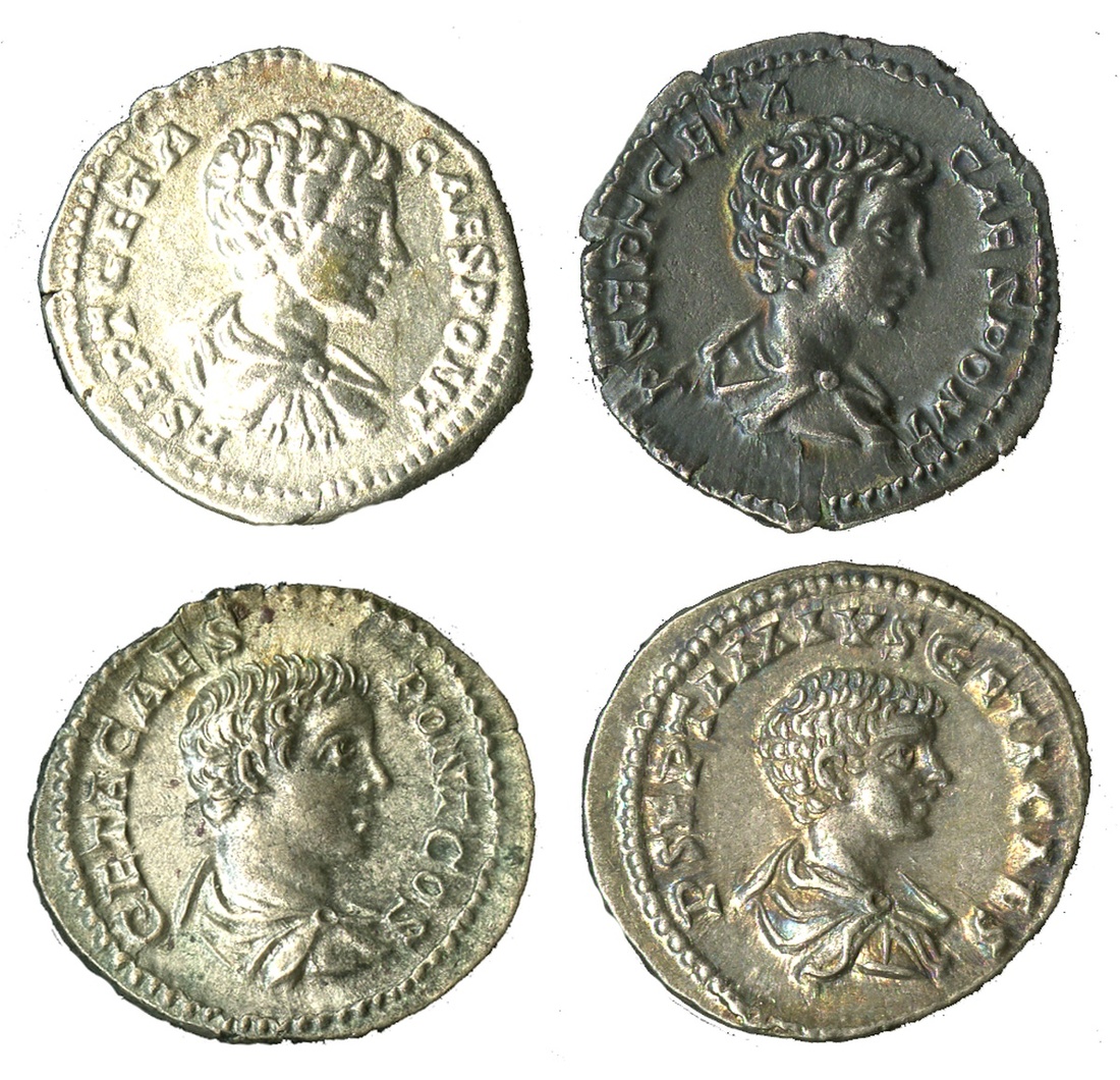 Roman Imperial. Geta, as Caesar (198-209). Quartet of AR Denarii. Boy's, bare-headed, draped bust right; and draped and cuirassed. Revs. Geta in military attire left, with baton and spear; Victory striding left, shield on base; Geta in priest's robes standing left sacrificing; and Minerva standing left. RIC 18, 23, 38b, 45. Near Extremely Fine-EF. The first ex Glendining Auction, June 1, 1989, lot 159, the third Spink Auction, Oct. 11, 1989, lot 291, the last ex CNA Auction, Sept. 26, 1990, lot 967. (4)