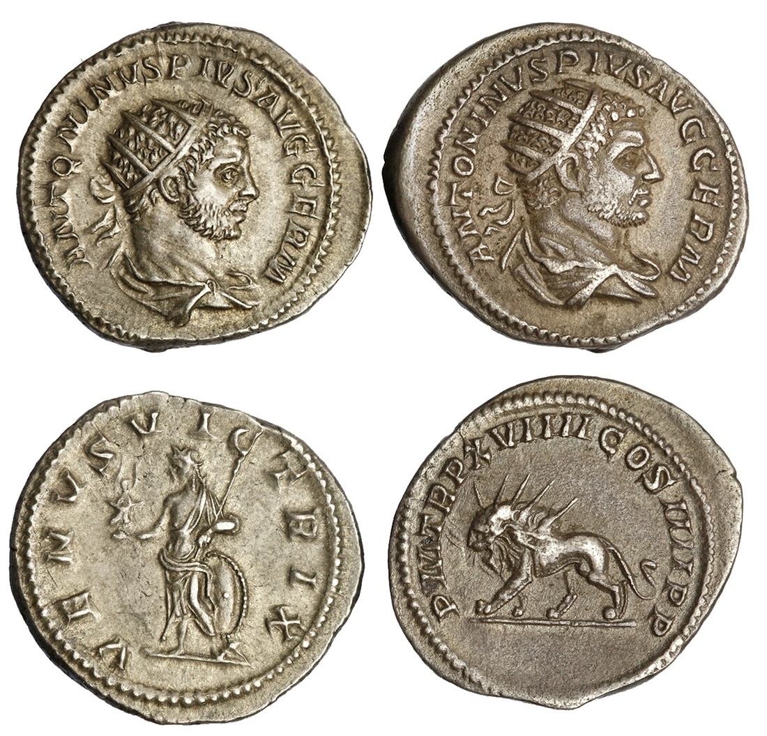Roman Imperial. Caracalla (198-217). Pair of AR Antoniniani. Rome. 215-217. 5.45 gms. Radiate, draped and cuirassed bust right, rev. Venus standing part left, holding Victory and scepter, leaning on shield set on helmet; 216. 4.92 gms. Rev. Radiate lion walking left, holding thunderbolt in its jaws. Both attractive slate gray, Extremely Fine. The first ex Glendining's Auction, June 1, 1989, lot 156. (2)